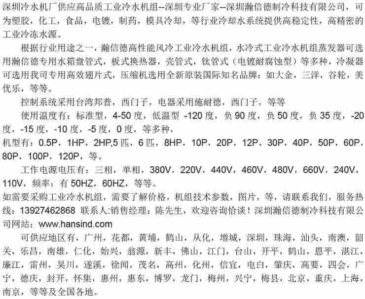 深圳低溫工業(yè)冷水機組哪個品牌好,深圳哪里有好的供應(yīng)商,推薦【深圳低溫工業(yè)冷水機組供應(yīng)商首先深圳瀚信德制冷】,低溫冷水機組多少錢一臺,請咨詢深圳瀚信德制冷,深圳瀚信德制冷是一家專業(yè)致力于低溫制冷機組,低溫工業(yè)冷水機組,低溫冷凍機組,研發(fā),生產(chǎn),銷售,安裝,維護,配件供應(yīng)為一體的綜合性服務(wù)的制冷設(shè)備生產(chǎn)廠家,瀚信德制冷只銷售高端品質(zhì)工業(yè)冷水機組,所以是一種優(yōu)質(zhì)品牌工業(yè)冷水機組。